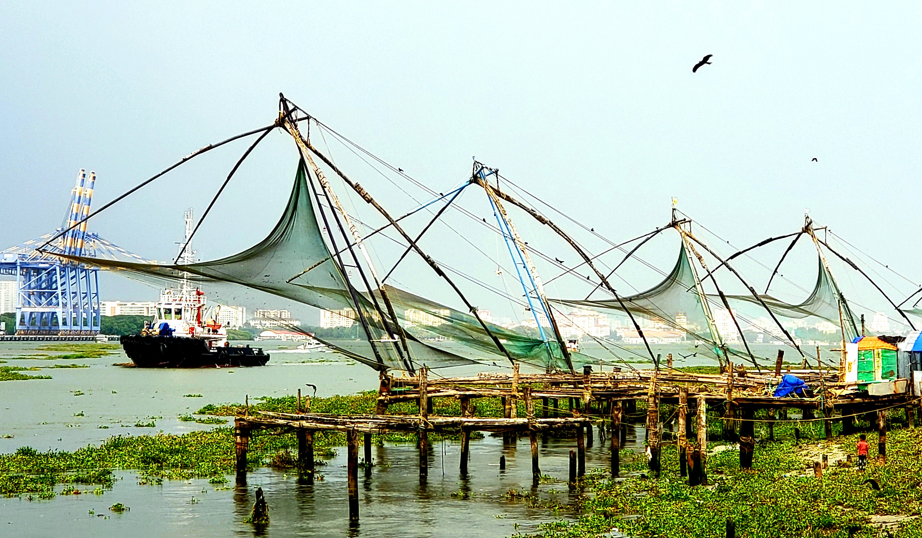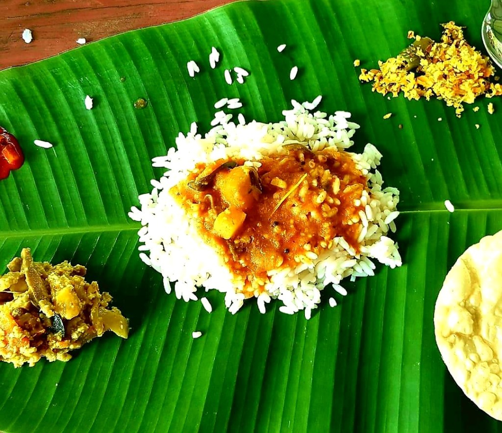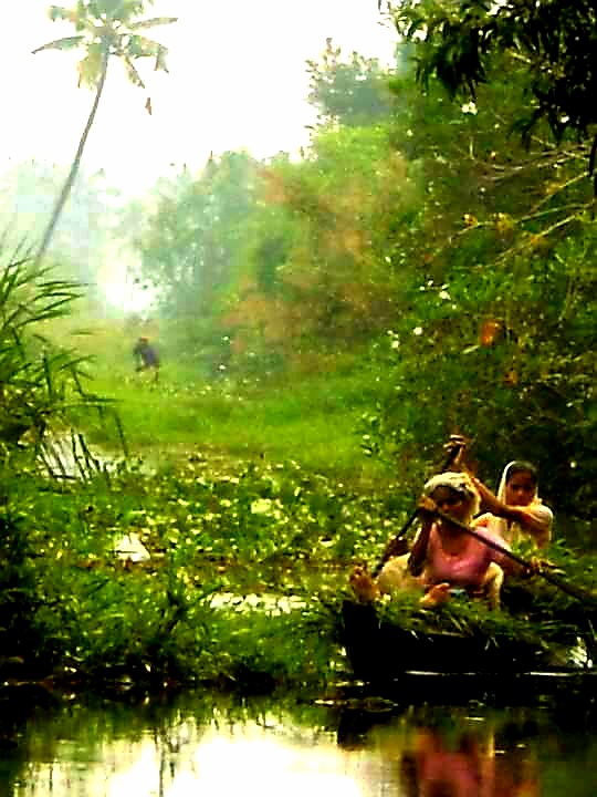 Idli rice cakes are cooked for breakfast with a spicy sambar. For lunch, we have traditional sadhya served on a banana leaf, licking the all the flavors, fiery, sweet, salty, sour, bitter from our fingers. Another day, we have Italian food. There are more smiles and I think the Keralan people are so beautiful. The ferry boat arrives, bringing a noisy horde of motor bikes. Islands of water plants float by to choke the port.