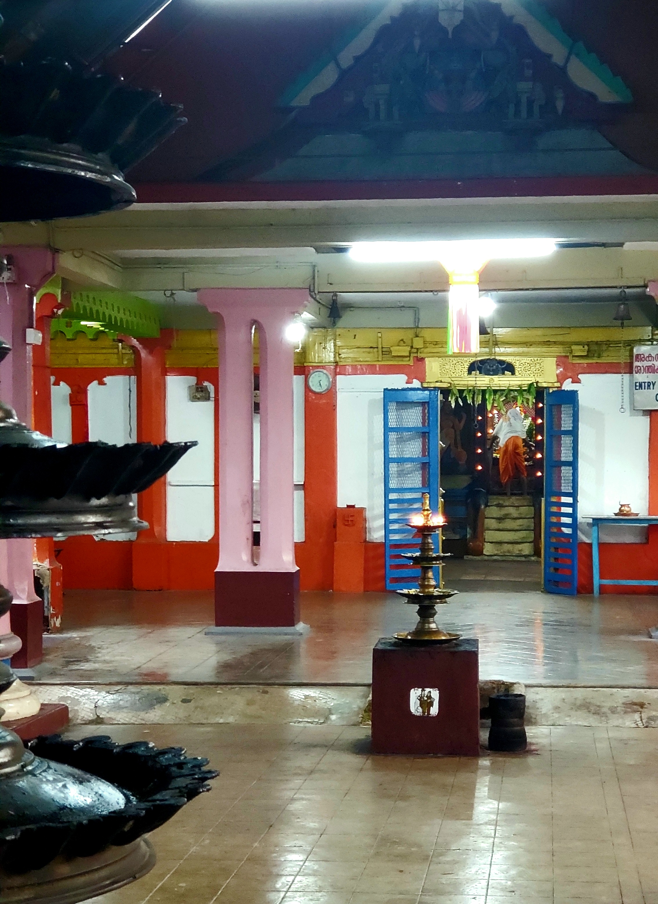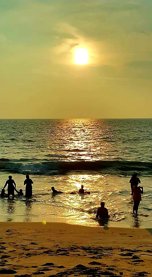 There is the heavy fragrance of the raatrani trees after the rain. The crows converse louder than the people who end the day at the waterfront. The sun sets beyond a warm sea that is soft, the same color as the sky. The steam from the backwaters retreats from the river with a cool breeze in the forest. Night comes and I go to the temple. I take off my sandals. There are but half a dozen of us inside. I am greeted with smiles. The diya candles lining the walls are lit. There is the smell of sandalwood. Then there is fire, water, fruit and flowers offered to the Gods in the Tradition that is older than time. The sweet of prasad is placed in my right hand. I touch the pandit’s feet.
